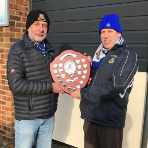 Our 2022/23 Supporter of the Season Steve 'Hughie' Marshall being presented with the Mark Barton Memorial Shield by Mark Randall. Photo credit: Jon Taffel
